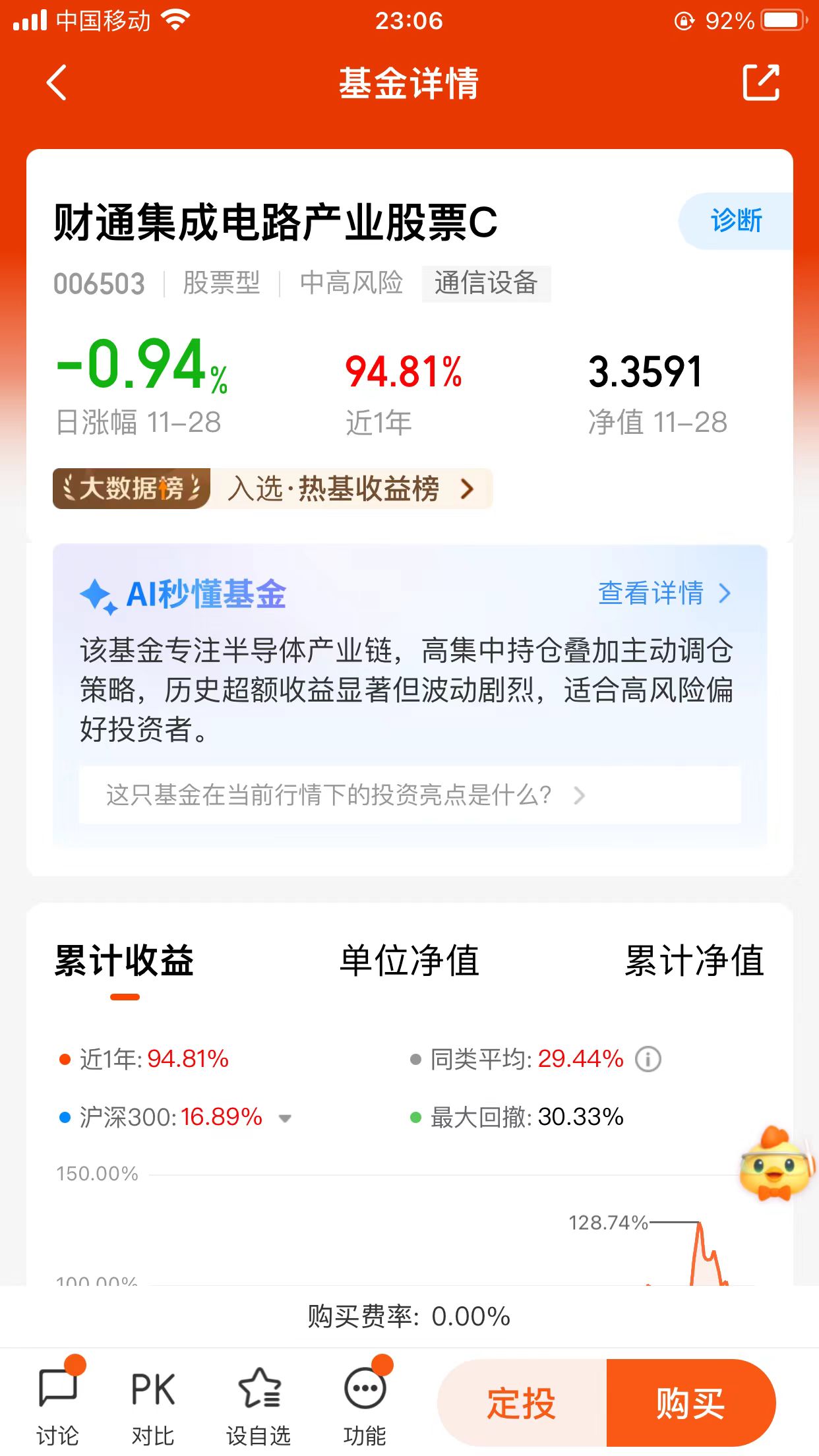 11 月市场波动中,平衡固收与权益才是王道。财通集成电路产业股票C作为半导体领域的优质基金,能够帮助投资者把握当前半导体产业高景气周期的投资机遇。建议采取 "核心 + 卫星" 配置策略,在固收保底的基础上,通过定投方式布局该基金,分享半导体产业成长红利。当前时点应以“政策确定性”对抗“市场不确定性”,通过财通集成电路基金把握硬科技主航道的同时,用固收+构筑安全垫。切记:产业趋势比短期估值更重要,但再好的赛道也需要严格的风险管理护航。@财通基金