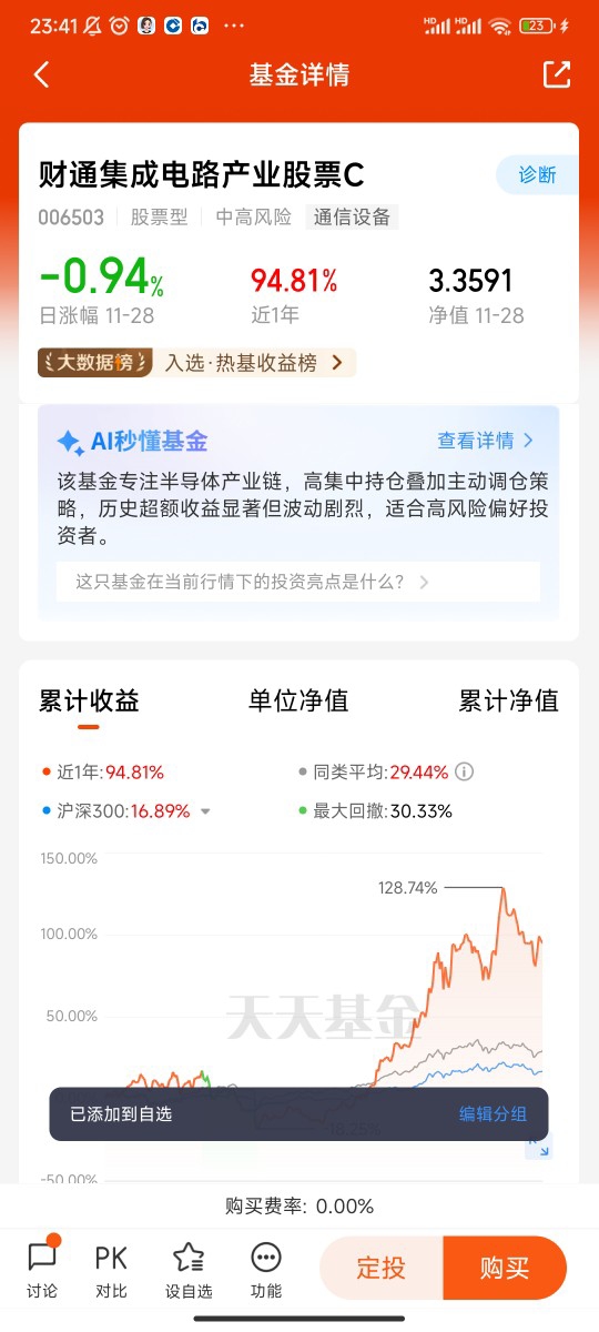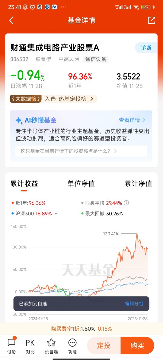 财通集成电路的产品特质,使其成为11月震荡市中布局科技赛道的“优选工具”。从持仓策略来看,基金采用“核心+卫星”的配置逻辑,既重仓沪电股份(9.79%)、生益科技(10.02%)等行业龙头筑牢核心仓位,又布局鼎泰高科、东材科技等细分领域“隐形冠军”捕捉弹性收益,前十大重仓股分散配置,避免单一标的波动对基金净值的过度影响。基金经理的“左侧布局+灵活调仓”能力尤为亮眼,在市场担忧半导体库存压力时,果断减持周期属性强的标的,增持因AI服务器需求爆发的PCB刀具企业鼎泰高科,后者三季度净利同比增180%,成为基金净值增长的重要推手;11月AI PC渗透率超预期之际,基金提前加仓FPGA芯片相关标的,精准把握推理端爆发机遇。此外,基金近一年换手率336.67%,擅长捕捉Chiplet封装、MR设备等细分领域Alpha机会,同时最大回撤(-42.98%)小于同类平均(-51.23%),在追求收益的同时守住风控底线。