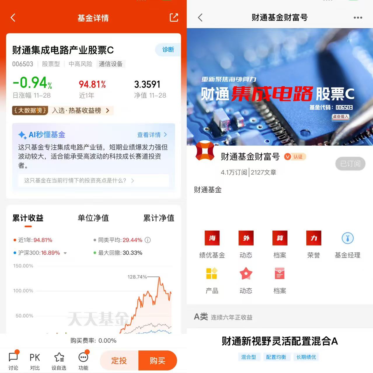 市场波动,本质是风险偏好与产业预期的再校准。对于投资者而言,与其纠结 “固收还是权益”,不如回归自身风险承受能力,构建 “稳守 + 进攻” 的动态组合。财通集成电路产业股票C基金作为聚焦高成长赛道的工具,凭借深度产业研究与专业管理,为投资者提供了分享集成电路产业红利的有效途径。记住:市场从无 “躺赢” 神话,唯有理性配置与长期视角,才能在波动中锚定真正的投资机遇。@财通基金