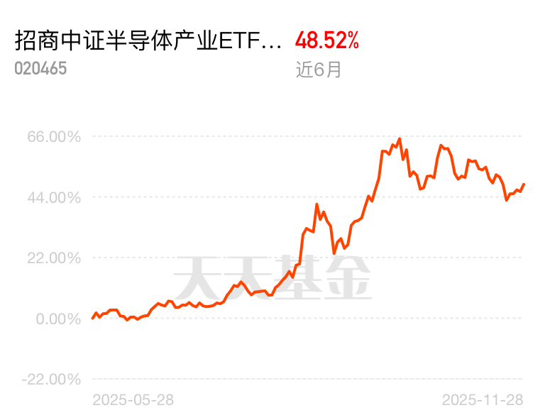 国内半导体代工技术突破,指数午后拉升突破短期压力。招商中证半导体产业 ETF 联接 C 近 6 个月 48.52%,AI 算力 + 端侧应用双轮,12 月红利持续释放。$招商中证半导体产业ETF发起式联接C$