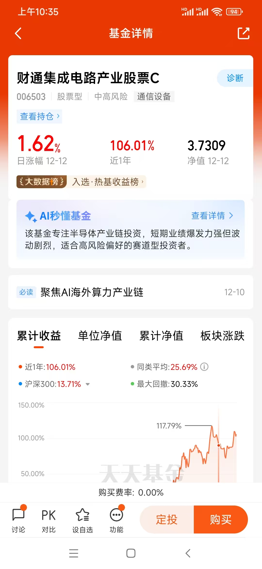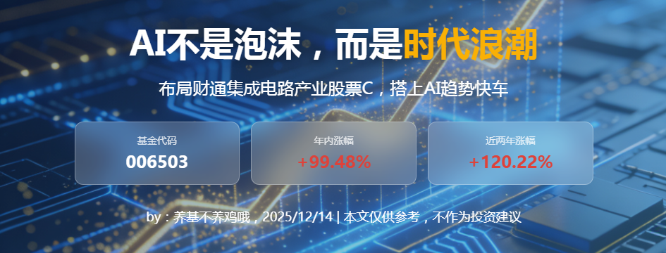 最近一段时间,关于“AI泡沫”的言论有些多,但我对此完全不认同。我不是什么专业人士,所以只凭直观感受和投资逻辑站队:AI绝非虚火升腾的泡沫,而是能改变未来的时代浪潮。我们要做的,不是纠结争议,而是找到合适的方式搭上这波趋势快车,而我自己的选择是——财通集成电路产业股票C(006503)。