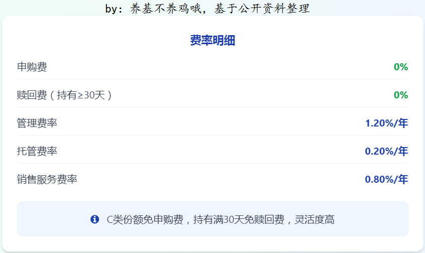 二是费率友好,C类份额免申购费,持有满30天就免赎回费,每年的管理、托管和销售服务费率加起来也比较合理,小资金分批定投完全没压力。