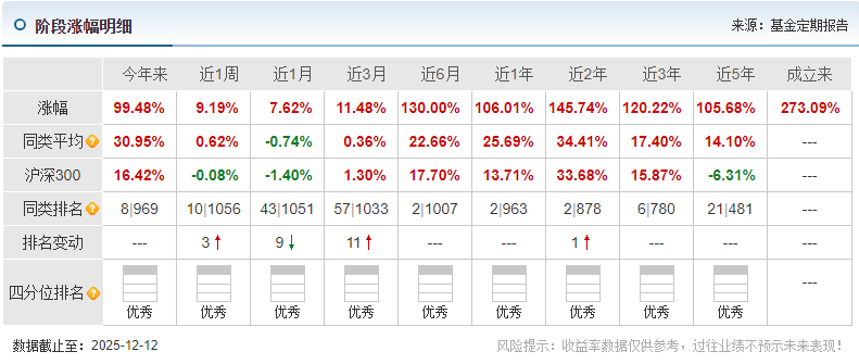 一是业绩表现亮眼,截至12月12日,今年以来涨幅已经高达99.48%,差不多翻倍了,在同类基金里表现很突出;