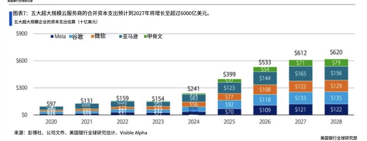 第二,是资本支出与预期回报之间的巨大割裂。在“Scaling Law”(规模定律)的推动下,大家都在拼命砸钱,试图大力出奇迹。光是微软、Alphabet、亚马逊和Meta这四家巨头,当前财年的资本支出预计就高达3600亿美元,其中大部分投向AI基础设施,明年可能还要增加到4200亿美元。整个行业未来几年的总投资规模更是被预估在数万亿美元级别。