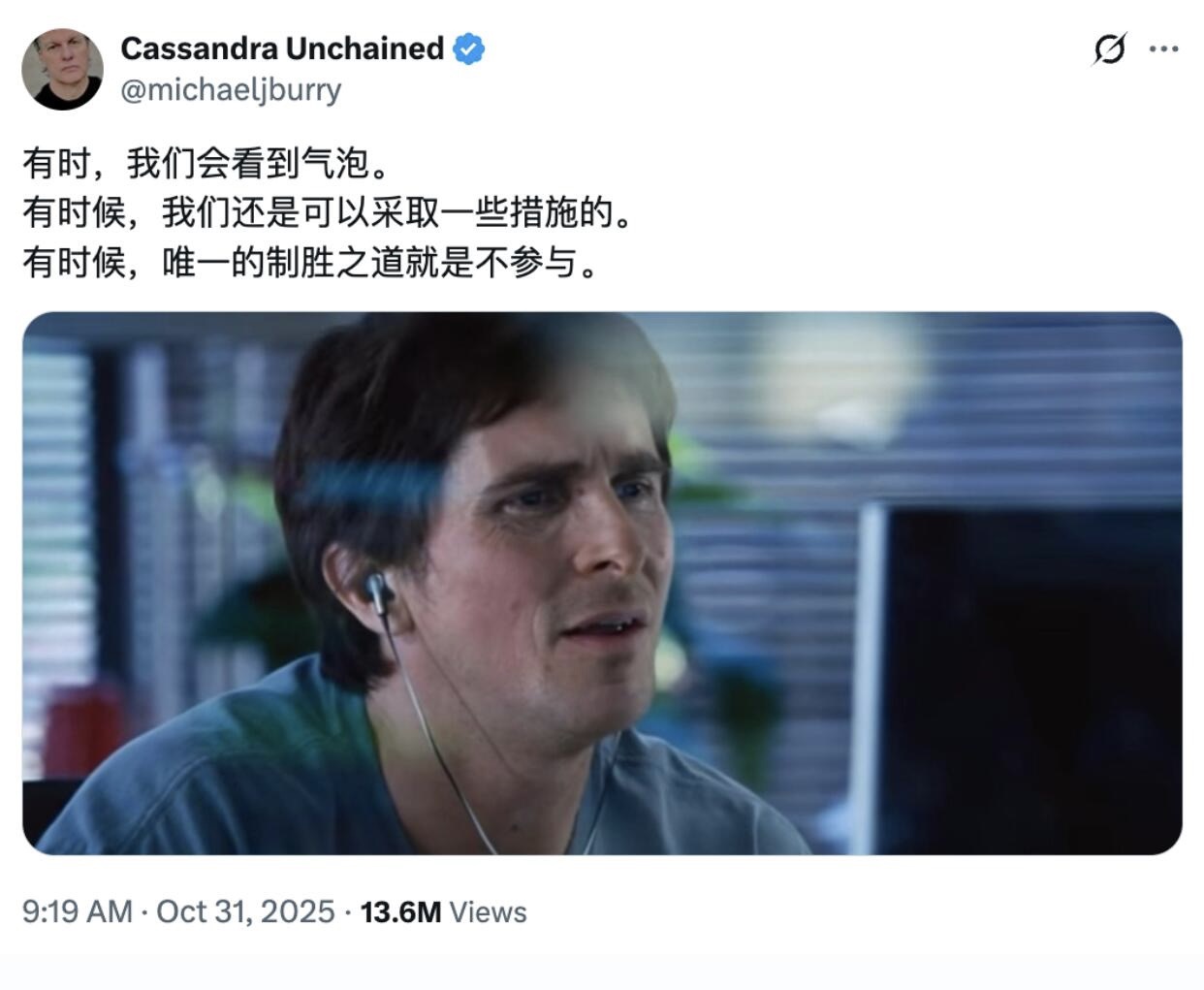 最后,我想起《大空头》原型、对冲基金经理迈克尔·伯里(Michael Burry)近期的一个帖子,他提醒人们注意市场狂热背后的风险。历史不会简单重复,但总是押着相似的韵脚。在所有人都为之疯狂的时候,保持一丝冷静和警惕,或许不是坏事。盛宴终有散场时,只是没人知道钟声会在何时敲响。
