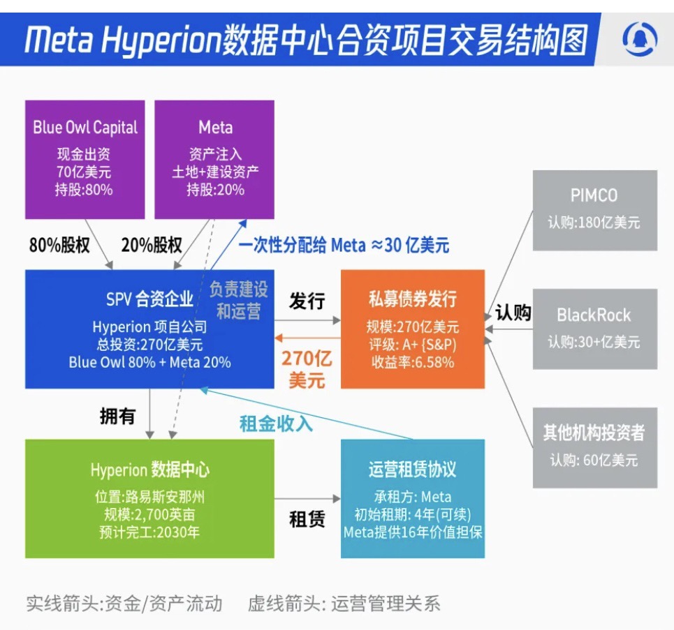 第三,一个更值得警惕的信号是,AI领域的金融链条正在变得异常复杂,甚至出现了“表外化”的趋势。最典型的例子就是Meta的“Hyperion”数据中心项目。这个总投资高达270亿美元的项目,结构非常精巧:华尔街资本Blue Owl出资约80%,Meta只出20%,然后通过设立特殊目的实体(SPV)发行债券来融资。通过这种操作,Meta既不用在资产负债表上计入这笔巨额资产和负债,也不用一次性掏出270亿现金,仅仅通过“租赁”就实现了拥有和使用数据中心的目的。这完美地美化了上市公司的现金流量表和资产负债表。