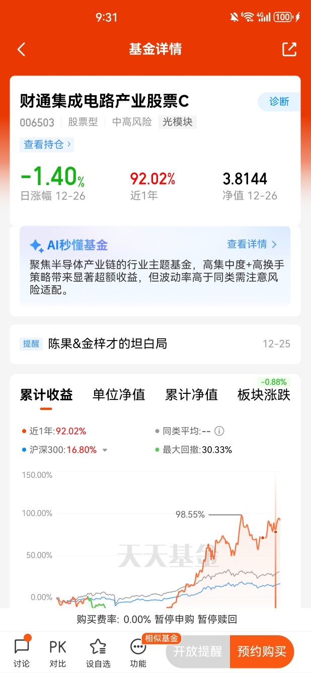 #2026你怎么看?# $财通集成电路产业股票C$ 2025年的A股市场,真的让我体会到了什么叫极致波动。追高被套、踏空热门赛道的情况轮番上演,看着AI、储能板块一波波大涨,自己却因为犹豫错失机会,说不遗憾是假的。好在四季度我果断入手了财通集成电路产业股票C,从12月建仓到现在,已经拿到了9.85%的持有收益率,这也让我对半导体赛道的投资,有了实实在在的新思考。#晒收益#