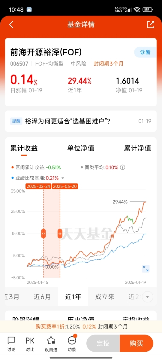 作为“选基困难户”,我曾深陷市场波动的焦虑——热点轮动飞快,单一基金波动剧烈,直到遇见前海开源裕泽FOF(代码:006507)。这只基金的独特魅力在于其 “三三四”多资产配置策略:三成权益资产捕捉成长机遇,三成黄金抵御市场风险,四成固收资产作为“压舱石”。截至2026年1月19日,其近一年收益率达29.25%,最大回撤仅-3.08%,夏普比率高达1.84,堪称“攻守兼备的典范”。