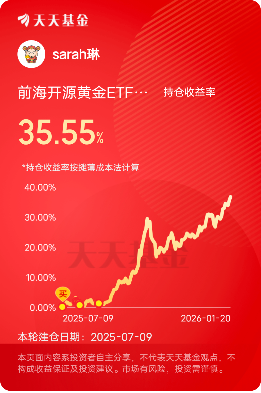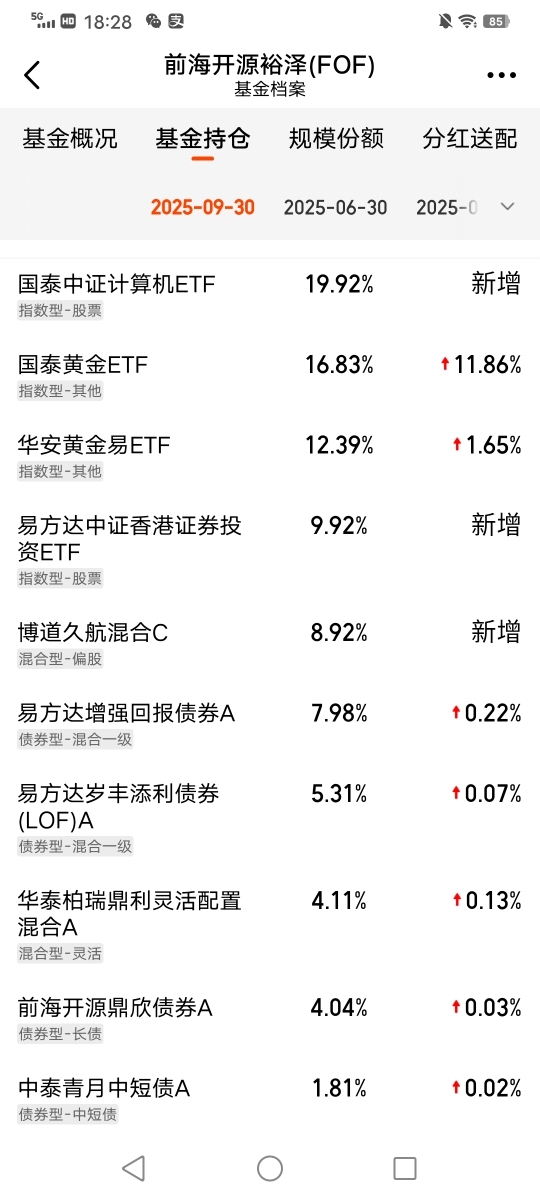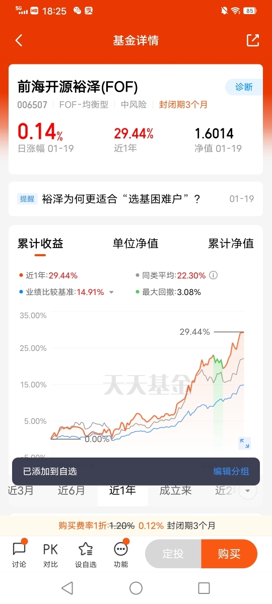 我选择$前海开源裕泽(FOF)$ 的期待是稳中有进,加个自选观察一下,这只产品是fof基金中的基金,持仓配置比较全面,股债都有,回撤控制的很好,重仓基金以计算机,黄金为主,搭配了混合型,长短债产品,非常适合不会股债搭配的投资者做收益增厚,风险等级适中,也可以作为高风险投资者底仓配置的选择。封闭期3个月避免频繁操作,可以当个定存投资。@前海开源基金 #晒收益#