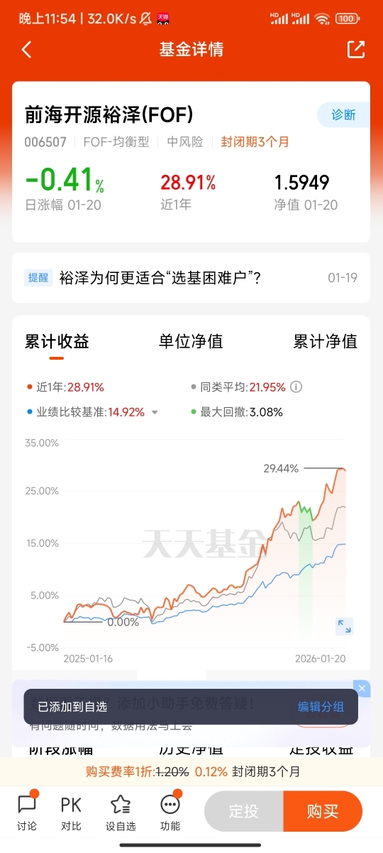我选择前海开源裕泽(FOF)的期待是: 作为一个普通投资者,自己研究基金和做资产配置总觉得力不从心,选单只基金怕踩雷,分散买又不知道怎么搭配比例,选这只FOF,就是希望能靠专业的团队帮我做好一站式的资产配置,不用自己费心琢磨各类资产的涨跌节奏。我期待它能凭借股、债、商品等多品类的配置逻辑,把单一板块的波动风险降下来,不像纯股票基金那样大起大落,也比纯债基金多一点收益弹性,在市场行情不好的时候能稳住净值,行情好的时候也能跟上节奏,实现资产的长期稳定增值。