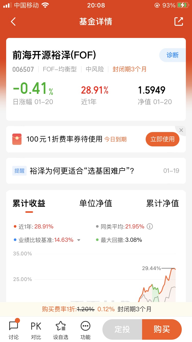 前海开源裕泽成立于 2018 年 11 月 22 日,是一只混合型 FOF 基金,基金经理为李赫。它最特别的地方在于其定期开放的运作模式,每 3 个月封闭运作,之后进入开放期,开放期原则上不少于两个工作日、不超过二十个工作日。2026 年 1 月 19 日至 1 月 30 日是它的一个开放期,1 月 31 日起又将进入下一个封闭期。这种运作模式对于投资者来说,有好有坏。好处是可以避免频繁申赎对基金运作的干扰,基金经理能更好地执行中长期投资策略;坏处是在封闭期内无法自由赎回,资金流动性会受到限制,投资者需要提前做好资金规划,确保这部分资金在封闭期内不会被急用。