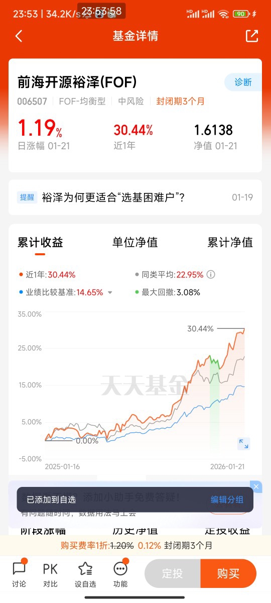 我选择前海开源裕泽(FOF)的期待是: 作为一个普通投资者,没太多时间天天研究基金和市场,最想要的就是省心又稳健的投资,这只基金刚好戳中了我的需求。首先盼着它能靠专业配置帮我避开踩坑,毕竟FOF本身就是投其他优质基金,相当于请了个专业团队帮我筛选。这只基金不把钱都放一个篮子里,三成权益类、三成黄金、四成固定收益的配置特别合我意,股市好的时候能跟着赚点收益,市场波动大的时候,债券和黄金又能稳住阵脚,不用像自己买单一基金那样担惊受怕。