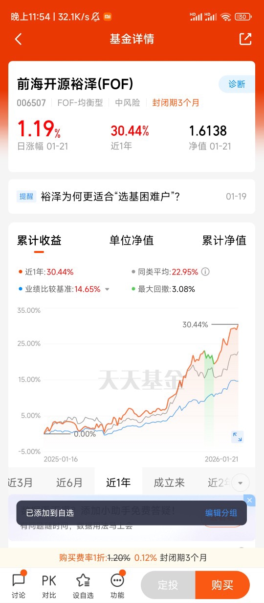 我选择前海开源裕泽(FOF)的期待是: 作为一名普通投资者,自己研究基金和资产配置总觉得力不从心,选单只基金怕踩雷,分散买又不知道怎么搭配才合理,所以选这只FOF,就是希望能借着专业团队的能力,把资产配得更稳、更省心,不用自己天天盯盘研究各类赛道和品种。期待它能一直坚持多资产配置的思路,把钱分散投到债券、股票、黄金ETF这些不同品类的优质基金里,不像单只股基那样大起大落,毕竟它过往的最大回撤远低于沪深300,今年以来的波动也很小,希望后续依然能把风险控制住,让我拿着不用担惊受怕,哪怕市场震荡,也能稳住基本盘。