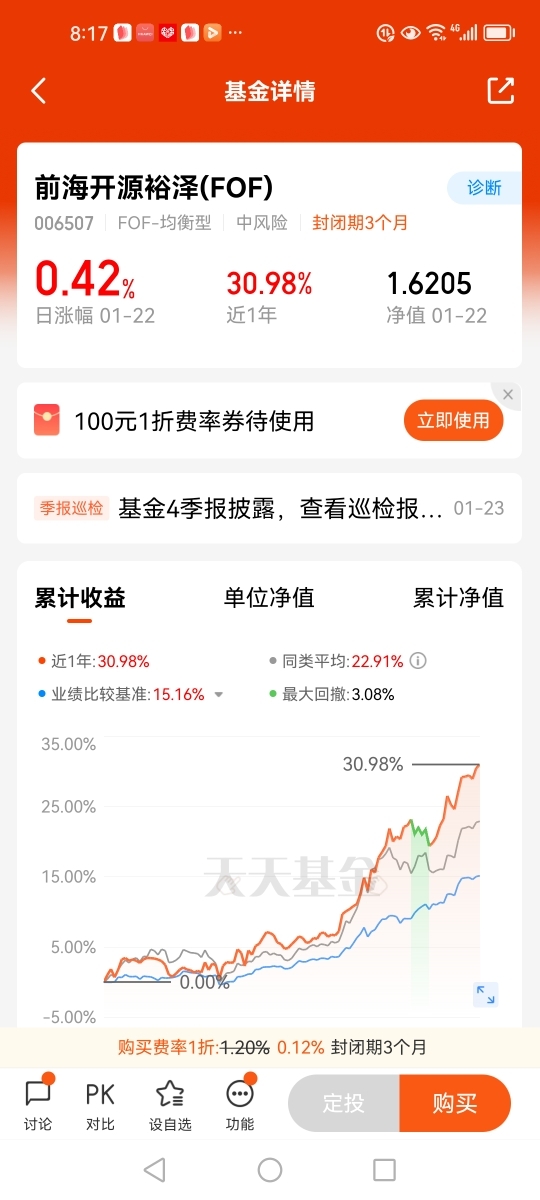 $前海开源裕泽(FOF$$注重风险控制,近1年、近3年、近5年最大回撤分别为3.08%、5.90%、9.01%,分别优于同类83%、96%、83%,而近3年同期沪深300指数最大回撤达-28%,该基金最大回撤很低,性价比显著。近3年收益达35.02%,同类排行3/24,业绩表现优秀,适合长期持有。在目前板块轮动频繁的市场,非常适合中低风险的稳健投资者。@前海开源基金