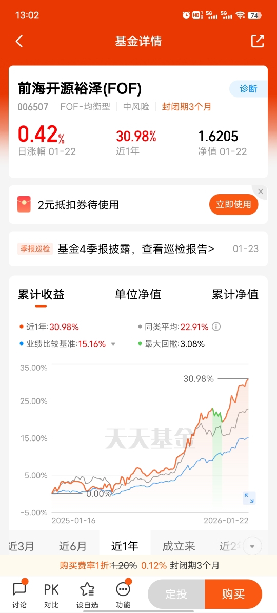 我选择$前海开源裕泽(FOF)$ 的期待是:该基金长期持有收益率高,从2018年成立至今已上涨62.05%。今年已上涨5.11%。本人喜欢长期持有获取复利收益,这支基金就比较适合我的风格,持有时间越长,收益越高。@前海开源基金