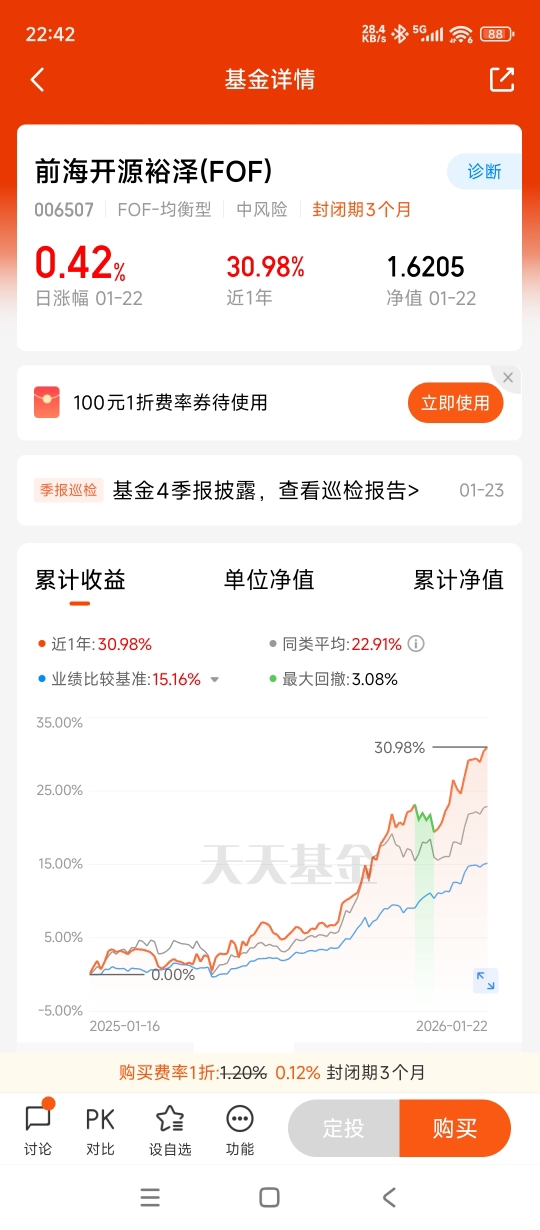 我选择$前海开源裕泽(FOF)$ 的期待是:作为一名普通上班族,平时工作忙、没时间盯盘,选基金总是纠结。看到这只FOF采用量化策略,追求风险收益比,风格稳健,近一年收益率表现也比较靠前,感觉很适合我这种“选基困难户”。希望借助它来分散风险、平滑波动,在行情多变的当下,能帮我管住手、稳住心态,做一个长期、理性的投资者。也期待未来能通过这只基金,慢慢学会资产配置的思路,不再盲目跟风。