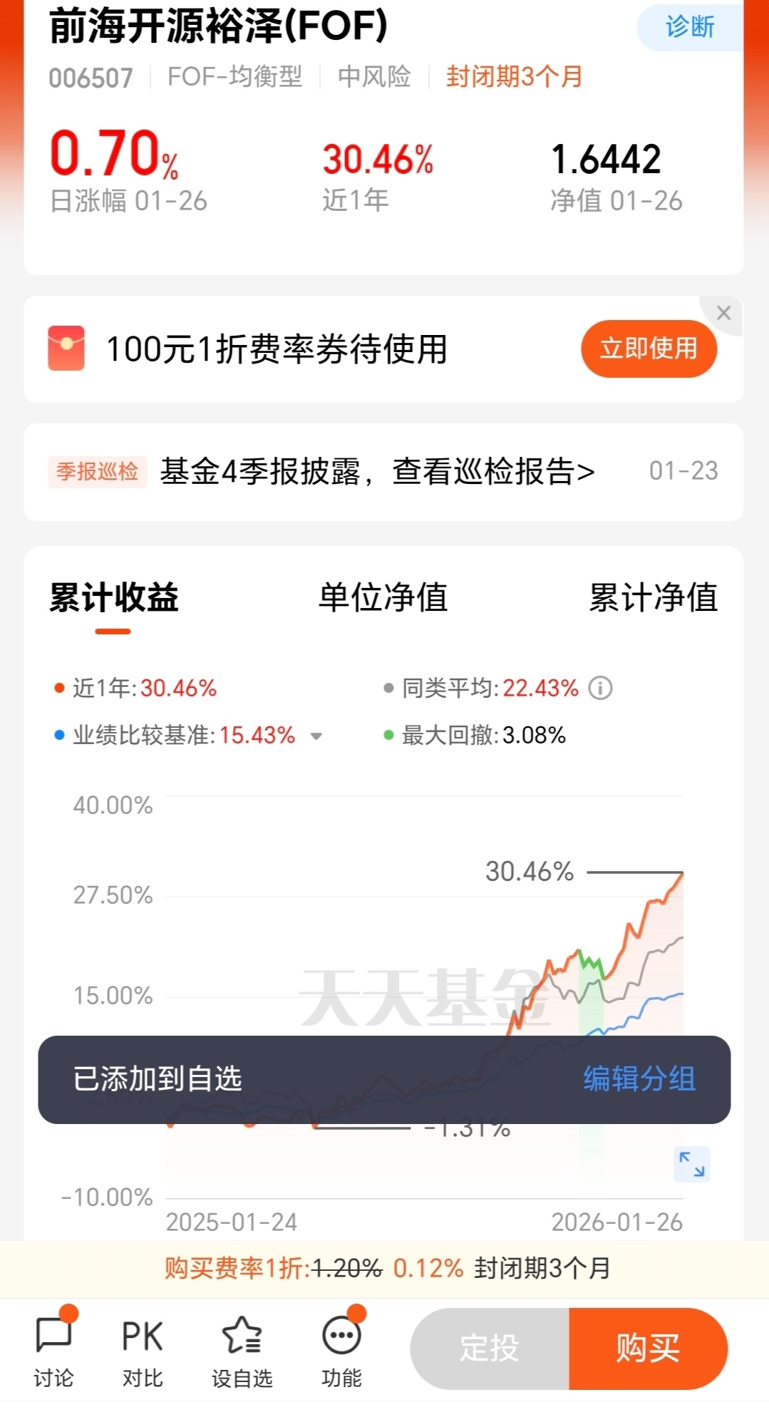 我选择$前海开源裕泽(FOF)$的期待前海开源裕泽为中风险定期开放混合型FOF,基金经理李赫任职超4年,采用风险平价+多资产配置策略,最新净值1.6327(01-23),日涨0.75%,规模0.56亿,成立以来收益63.27%,年化8.82%,业绩表现亮眼。业绩端,近6月/1年收益达20.31%/30.62%,均跑赢混合型FOF同类平均,近3年累计收益36.04%,年化12.01%;风控表现突出,最大回撤仅9.01%,远低于沪深300,夏普比率1.29,风险收益比优于78%同类。