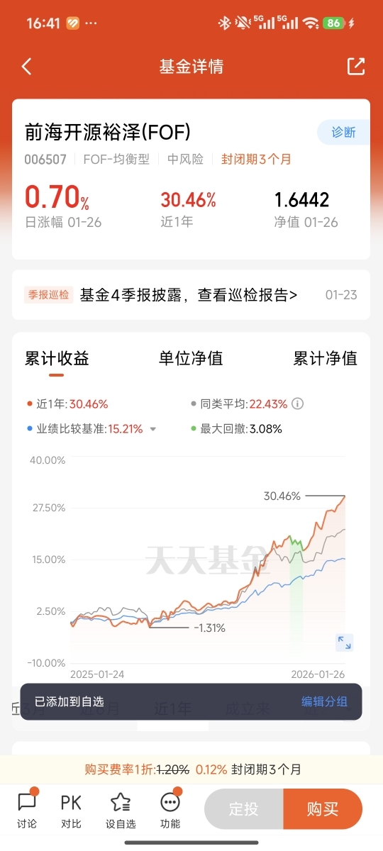 我选择$前海开源裕泽(FOF)$ 的期待是:这只基金采用量化投资的策略,更能够按照程序来投资,减少认为的追涨杀跌,而且近段时间的收益率很不错,是一只优质的好基金!!