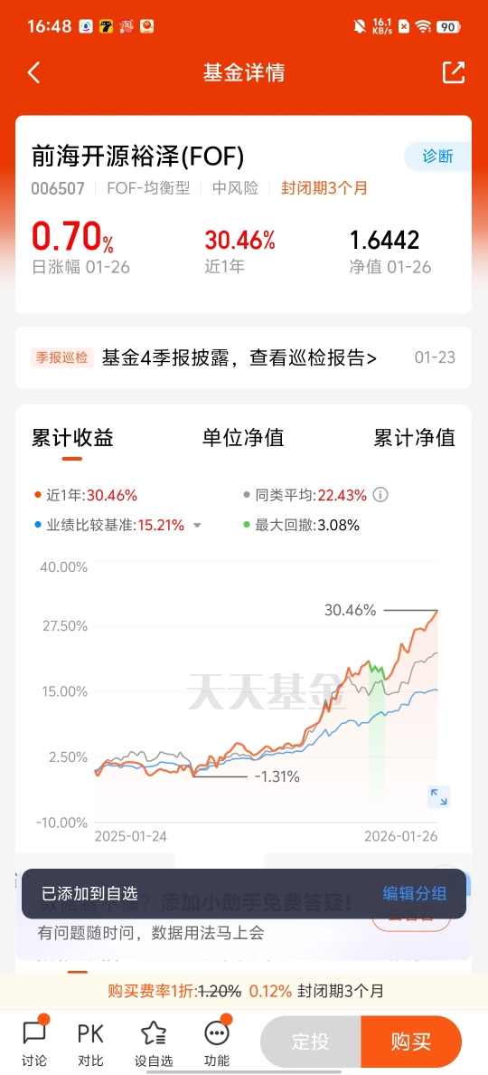 我选择$前海开源裕泽(FOF)$ 的期待是:希望这只基金在接下去的日子中,能够一如既往的保持过去一年的上涨行情,让我们能够安心的持有这只基金!!