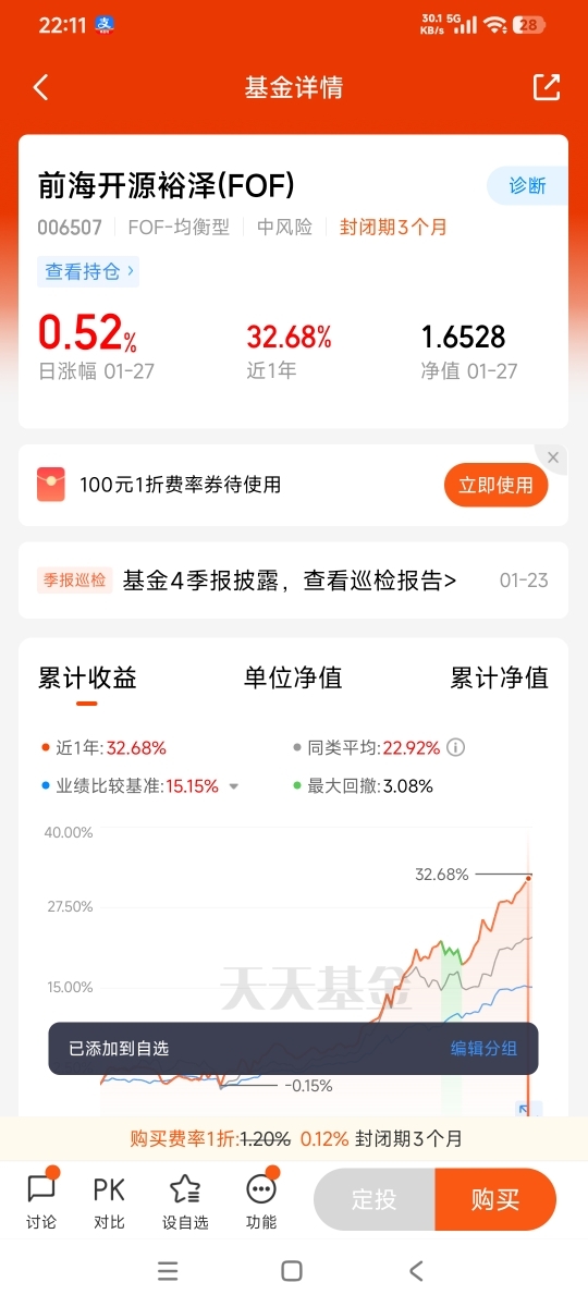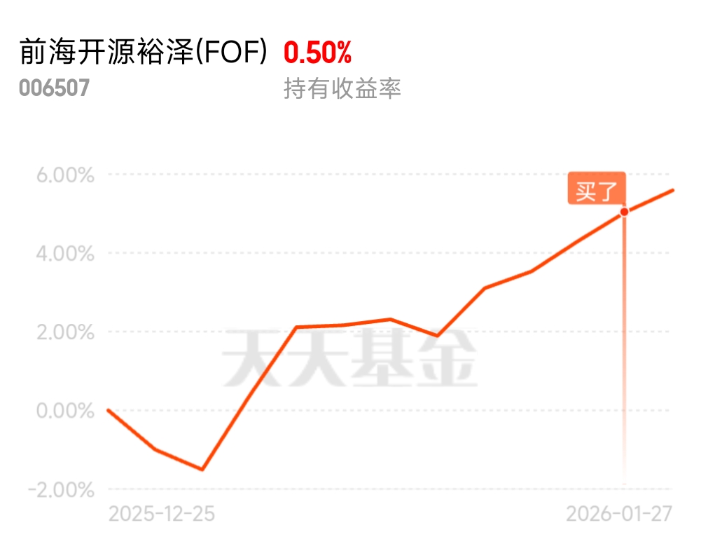 最近一直想找一款能贴合长期持有的理财方向,兜兜转转了解了不少品类,最终把目光落在$前海开源裕泽(FOF)$ 上,也是慢慢了解后才发现,这款产品刚好契合了自己想要的稳扎稳打,也让原本面对众多选择时的犹豫慢慢消散,只觉得选对了方向比盲目跟风要重要太多。