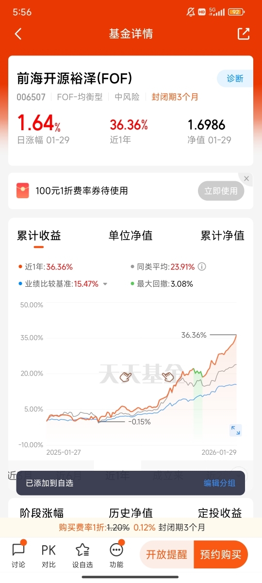 对比市场上众多基金,要么追求高收益却伴随大幅波动,让人寝食难安;要么风格过于稳健,收益水平难以跑赢通胀,而前海开源裕泽(FOF)却打破了“稳健与收益不可兼得”的困境。它以FOF的专业模式解决普通投资者的选基痛点,以安全边际为核心构建稳健组合,以科学配置实现长期超额收益,这种“省心、稳健、高收益”的特质,在当前市场环境下实属难得。对我而言,选择这只基金,不仅是选择一种投资产品,更是选择一种适合普通人的投资生活方式——不用耗费大量时间研究市场,不用承受过度的波动风险,却能分享经济发展与专业投资的红利,在安心工作、享受生活的同时,实现资产的稳步增值。