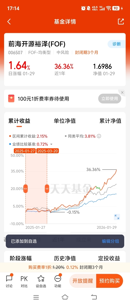 我选择$前海开源裕泽(FOF)$ 的原因,这是一只注重安全边际、风格稳健的权益资产基金,近一年收益率超28%,同类排名第一。