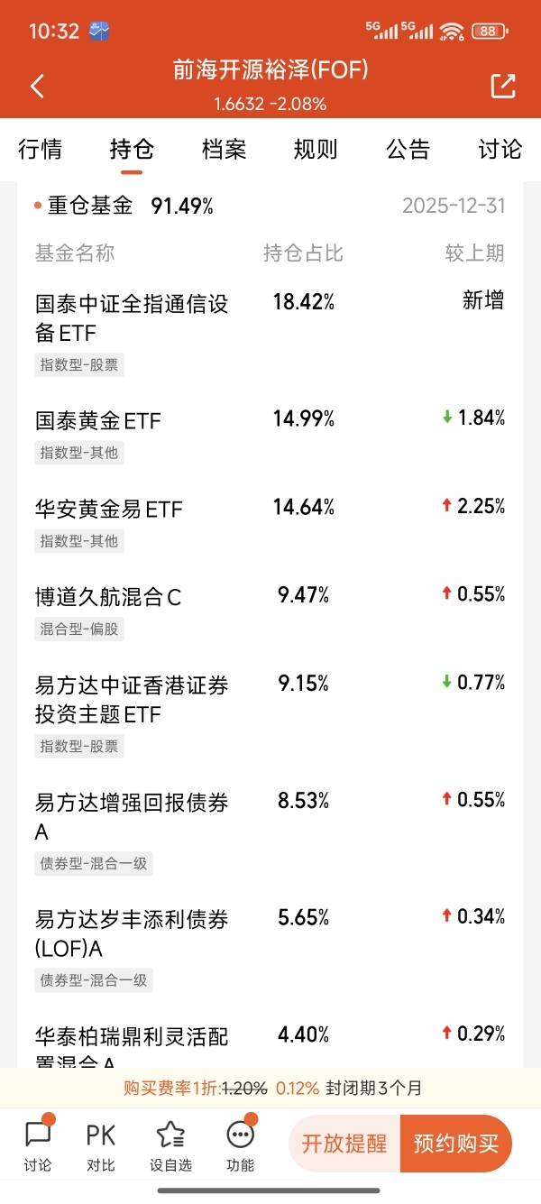 第二,资产配置的合理性。作为一只偏债混合型FOF,它的底层资产配置让我看到了专业团队的价值。91.49%投资于基金类资产,其中既有黄金ETF这样的避险资产(国泰黄金ETF、华安黄金易合计占比近30%),也有通信设备ETF、港股通ETF等权益类工具,还有博道久航、易方达增强回报等固收+产品。这种"黄金+权益+固收"的多元配置,恰好契合了我对稳健增值的诉求。