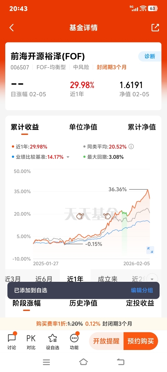 我选择$前海开源裕泽(FOF)$的期待是:当前市场震荡加剧,风格轮动提速,普通投资者面对海量基金常陷入选择困境。个人筛选易受情绪干扰,难兼顾风险与收益,单一基金配置更难抵御波动。前海开源裕泽(FOF)立足专业资产配置,精准破解选基痛点。