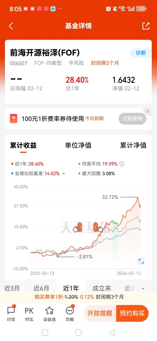 我选择$前海开源裕泽(FOF)$ 的理由有三:一是收益稳。前海开源基金公司FOF基金管理团队坚持价值投资,注重安全边际,风险控制严格,管理风格稳健,回撤控制优秀,近1年最大回撤只有3.08%,收益率超过28%,满足了持有人既要稳又要赚的愿望!二是费用低。一般的同类基金运作费用在1%以上,而前海开源基金公司让利于投资人,使该基金的管理费率和托管费率共0.75%,明显低于同类基金,降低了投资人的成本,而且从长计议,复利计算,是一笔不小的收益。三是赎回“活”。该基金设置了一个季度的封闭期,不长不短,既有利于基金的稳定运营,又兼顾了投资人对资金的流动性要求。因此,$前海开源裕泽(FOF)$很适合理财知识缺乏的我,值得关注持有,相信会越来越优秀!