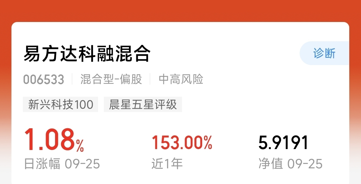 今天科技出现了回调。不过对于前期的涨幅来说,今天回调不算多。市场后续反弹还是会以科技为代表。$易方达科融混合$ 是主动的科技基金。聚焦新兴科技成长。持仓整体均衡。昨天又上涨了1.08%。近一年涨幅达到了153%。而且遇到波动稳定性好。长期收益能力强。期待继续再突破。