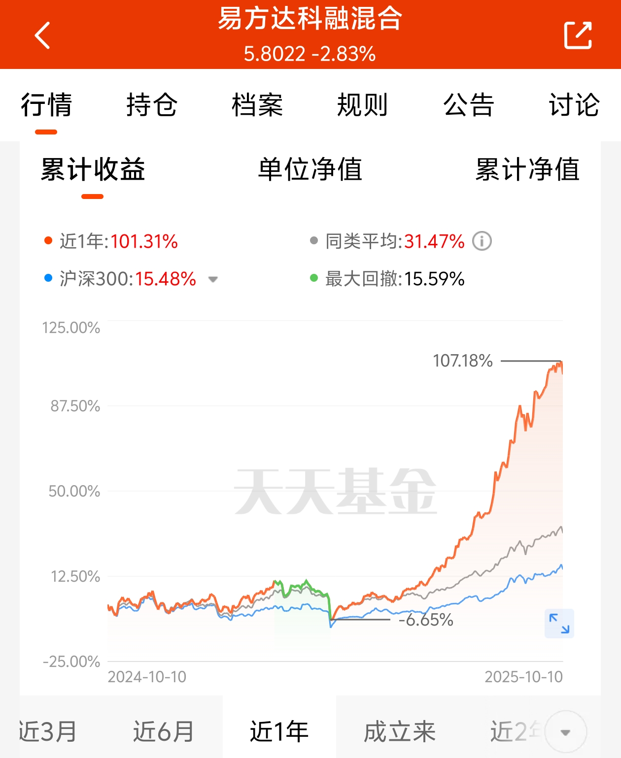 受地缘政治影响,今天大盘指数大幅低开,但是盘中表现还是不错的,尾盘跌幅收窄!$易方达科融混合$ 其近一年涨幅101.31%,在同类业绩中尤为亮眼。目前由于新的关税问题,大盘进行调整。流星认为目前是个好机会!4.7关税战就是个很好的例子,黄金坑,干就完了,其持仓的光通信和军工电子,有强大的业绩支撑,流星相信后市还会有很大的上升空间