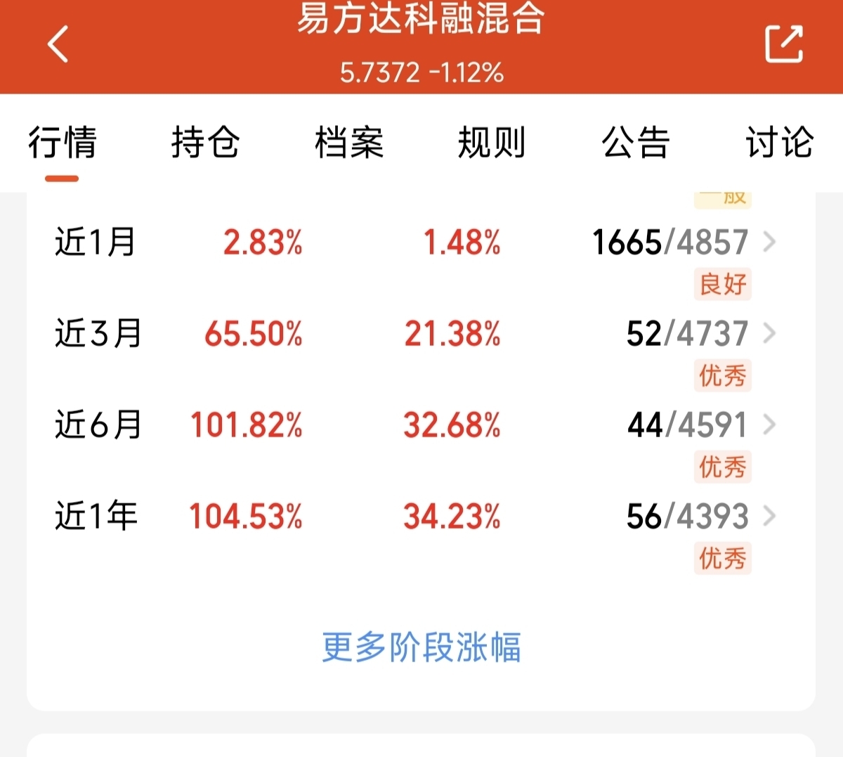 今天这调整确实有点多。不过长期来看,科技的主线还是在!单一的板块目前真的不好把握,$易方达科融混合$ 这只主动的科技基金。聚焦科技成长赛。持仓整体更均衡。近3月上涨了65.5%。近半年涨幅达到了101.82%。业绩是同类平均业绩的三倍还多。虽然短期迎来回调,但是未来上涨的空间依然比较大。我看好四季度的成长表现。