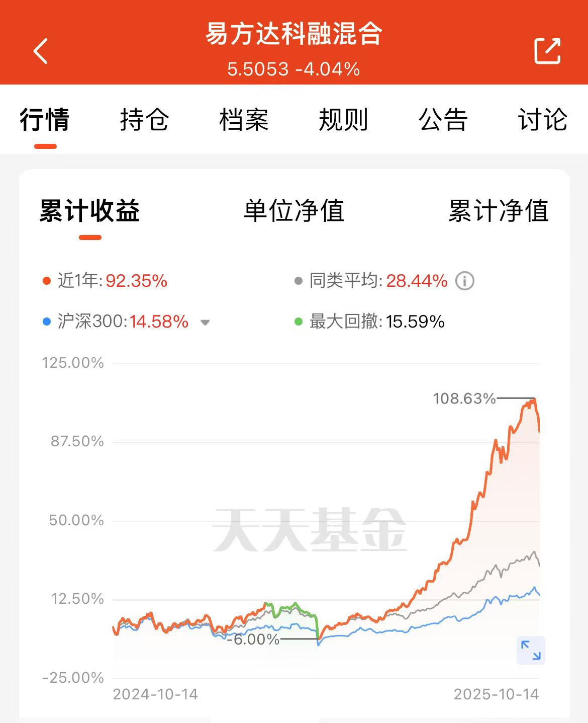 市场一震荡,身边好多人就开始纠结要不要追新热点,我反而觉得这时候更该看基金的“真功夫”。我坚定拿着易方达科融混合,就是看中它的长期性价比。它的核心优势是跨板块轮动,把科技、新能源、军工这些有长期潜力的赛道都覆盖了,不会因为单一板块回调就栽大跟头。从历史表现看,这只基真的抗造,近三年涨了不少,而且夏普比率持续优秀,说明承担同样风险能拿到更划算的收益。基金经理在2025年中期还在优化配置,紧跟AI、算力这些新机会,既不盲目激进也不落后趋势。虽然最近偶尔有单日回调,但看它近三个月57%的涨幅就知道弹性多好,这种能攻能守的基金,才适合长期拿着穿越震荡。