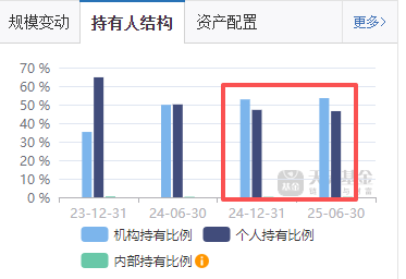 再一个,从持有人机构上看,近2个季度,机构持有人比例是逐渐增加的,截止2025.6.30,本产品的机构持仓占比超过50%了,还是比较大了,这也说明专业资金还是非常认可的。