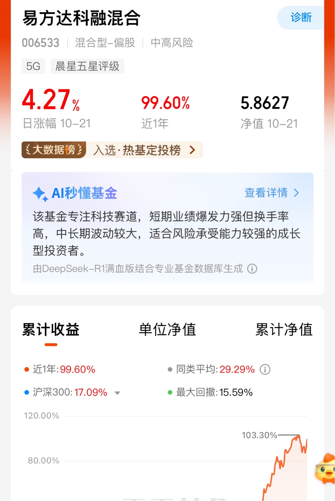 CPO今天小幅调整,我觉得主要是昨天涨幅太大了,部分高标有些承压,国产替代的逻辑一直存在的话,大科技的市场行情是非常不错的,但目前市场轮动很快,单一押注科技赛道的波动风险显著提升。在此环境下,$易方达科融混合$ 展现出均衡配置的价值。昨天业绩大涨了4.27%,近一年涨了99.6%,非常奈斯