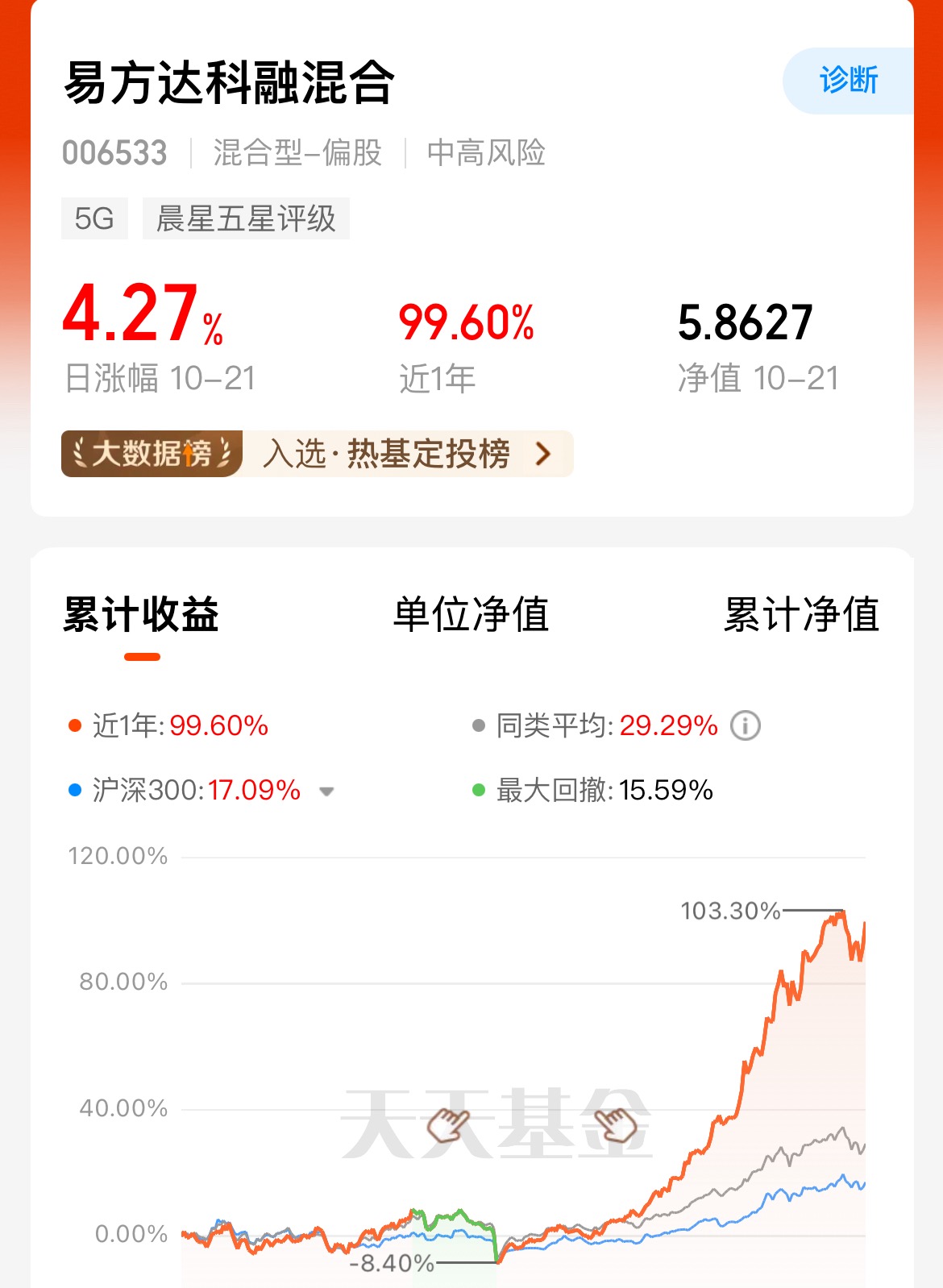 $易方达科融混合$ 昨天的表现太亮眼了!10月21日最新单日涨幅直接冲了4.27%,持有这只基的朋友估计都挺惊喜的,毕竟这波单日涨势在近期行情里算相当给力的了。