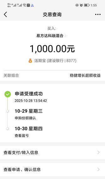 2.新兴科技:我今天继续加仓$易方达科融混合(OTCFUND|006533)$ 1000元。它聚焦科技成长赛道,重点布局了电子、通信、电力设备等,通过行业分散与个股精选构建投资组合,紧紧抓住当前A股的科技成长强势赛道,取得了非常优秀的过往业绩。本基金近2年大涨173.73%,近1年涨110.90%,近6月涨115.46%,近3月涨66.12%,近1周涨11.20%,各时间周期都处于同类型产品的头部,表现非常优秀。十月以来科技成长股迎来一波不小的回撤,本基金严控回撤效果明显,近1年最大回撤为15.59%。夏普比率为3.81。本基金近3年回撤37.69%,夏普比率1.12,性价比非常高,确实是能打能抗的稀缺产品,难怪本基金深受机构投资者的喜欢,持仓比例超过50%。随着中美贸易摩擦的缓和,本周科技成长赛道持续反弹,我认为新一轮的上攻正在开始,目前是布局本基金的好时机,我果断加仓。下面我晒一下买入操作记录: