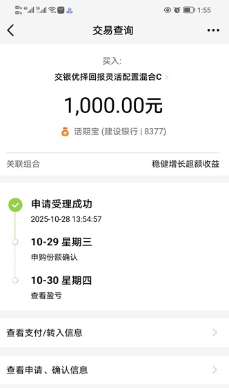 3.优择回报:我今天继续加仓$交银优择回报灵活配置混合C(OTCFUND|519771)$ 1000元。本基金是一支灵活配置偏股型基金,目前重点布局了通信设备、电子芯片半导体等科技成长领域,紧紧把握当前科技热门赛道,取得了非常不错的过往业绩。本基金近1年涨144.64%,近6月涨134.50%,近3月涨74.91%,近1周涨15.14%,表现非常优秀,对比很多同类基金,优势都十分明显。随着中美贸易博弈大趋势趋缓,本周开始资金明显回流科技赛道。算力CPO、光模块、PCB、人工智能、存储芯片、国产替代概念等迎来不错的反弹。随着世界互联网大会将在乌镇召开,届时将汇聚国内外众多互联网企业、专家。2025全球计算大会(CGC2025)将于11月在深圳举办。大会将聚焦计算领域的最新技术和发展趋势,吸引全球计算领域的专家、学者、企业代表等参与,共同探讨计算技术在各个领域的应用和创新。我认为科技成长仍是十一月的重点方向,主力资金这几天都在大力进场。本基金正好布局这些赛道,所以我看好它接下来的表现,今天果断加仓它。下面我晒一下买入操作记录: