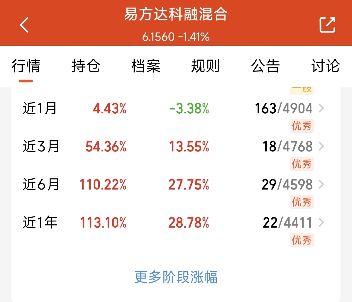 对于科技的长期表现,我是坚定看。虽然短期科技有所调整,但是对比前期的涨幅来看,目前调整的也不算多。而且今天已经开始逐渐企稳,未来随着市场反弹,科技有望再度主线回归。今天有关注到。$易方达科融混合$ 是主动的科技基金。今年来的表现一直不错。聚焦科技成长赛道。近半年涨幅达到了110.22%。是同类平均业绩的五倍还多。而且主动的科技混合基金,遇到波动回撤控制的也是更好。我坚定看好长期的稳定收益表现。
