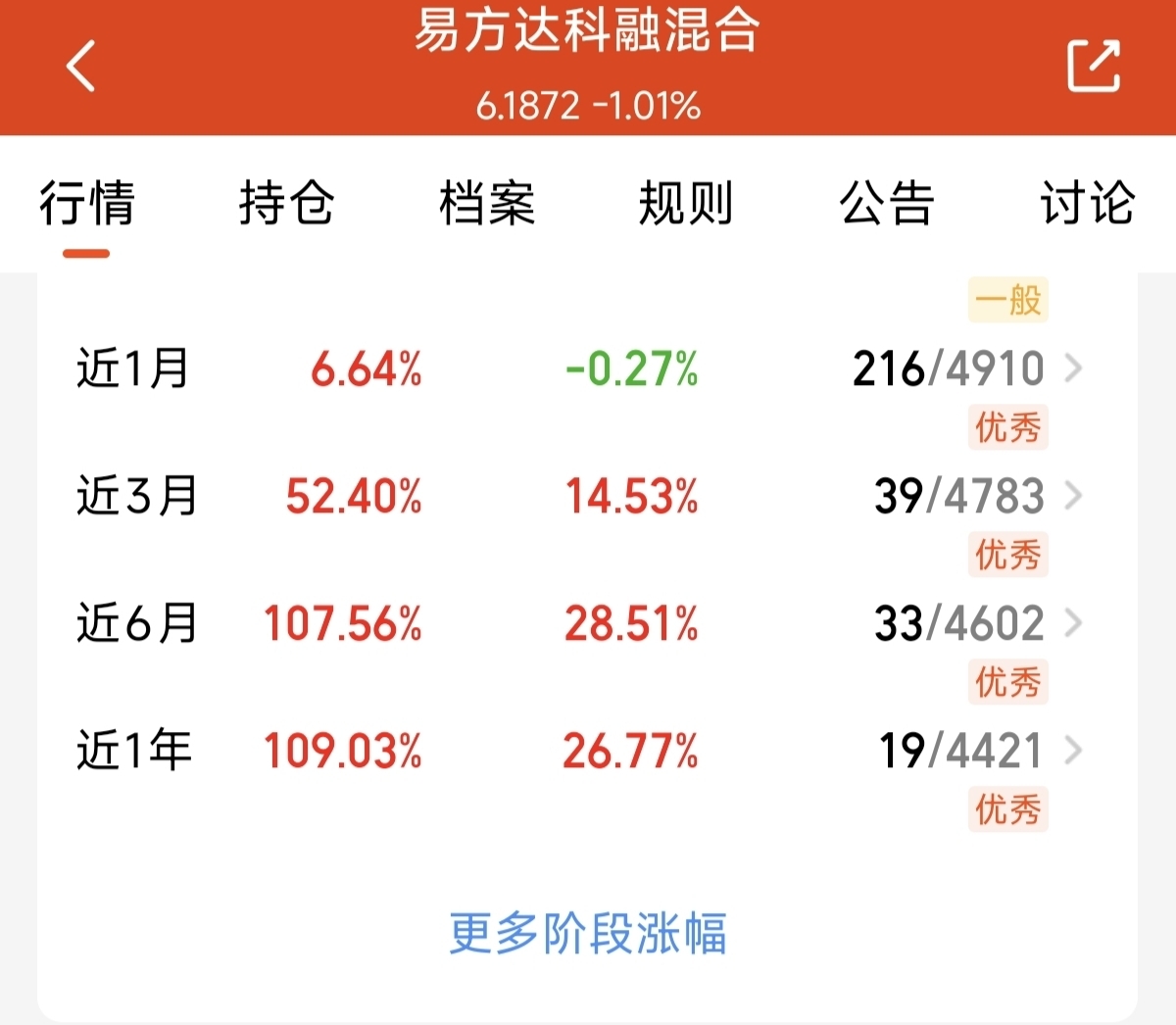 虽然科技目前长期是比较看好。但是科技的话分化整体还是比较高。而且每次上涨轮动也是比较快,单一的赛道基金波动还是比较大。$易方达科融混合$ 是主动的科技混合基金。聚焦科技成长赛道。持仓整体更均衡。长期盈利能力强。近3月上涨52.4%。近半年上涨107.56%。特别是在本轮科技的回调中。对比单一的科技赛道,基金还是要稳定的好的多。我坚定看好在未来科技成长中的收益表现。准备开始布局了。