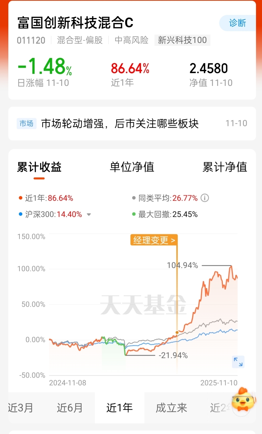 手头有易方达科融,也配了点富国创新科技C,它主投AI算力、光模块和芯片,近6个月