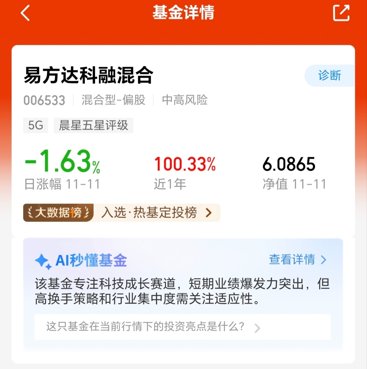 今日A股市场再次迎来回调趋势,其中科技赛道跌幅较多,不过当前回调反而是健康走势,但是当下成长行情轮动较快,单一持仓不如均衡布局,刚好我发现$易方达科融混合$ 不仅布局了科技赛道,并且还聚焦了反内卷相关新能源,近期业绩表现有目共睹,说明基金经理能力确实很强,能够精准控制回撤,从而捕捉市场趋势,我也准备慢慢定投上车了!
