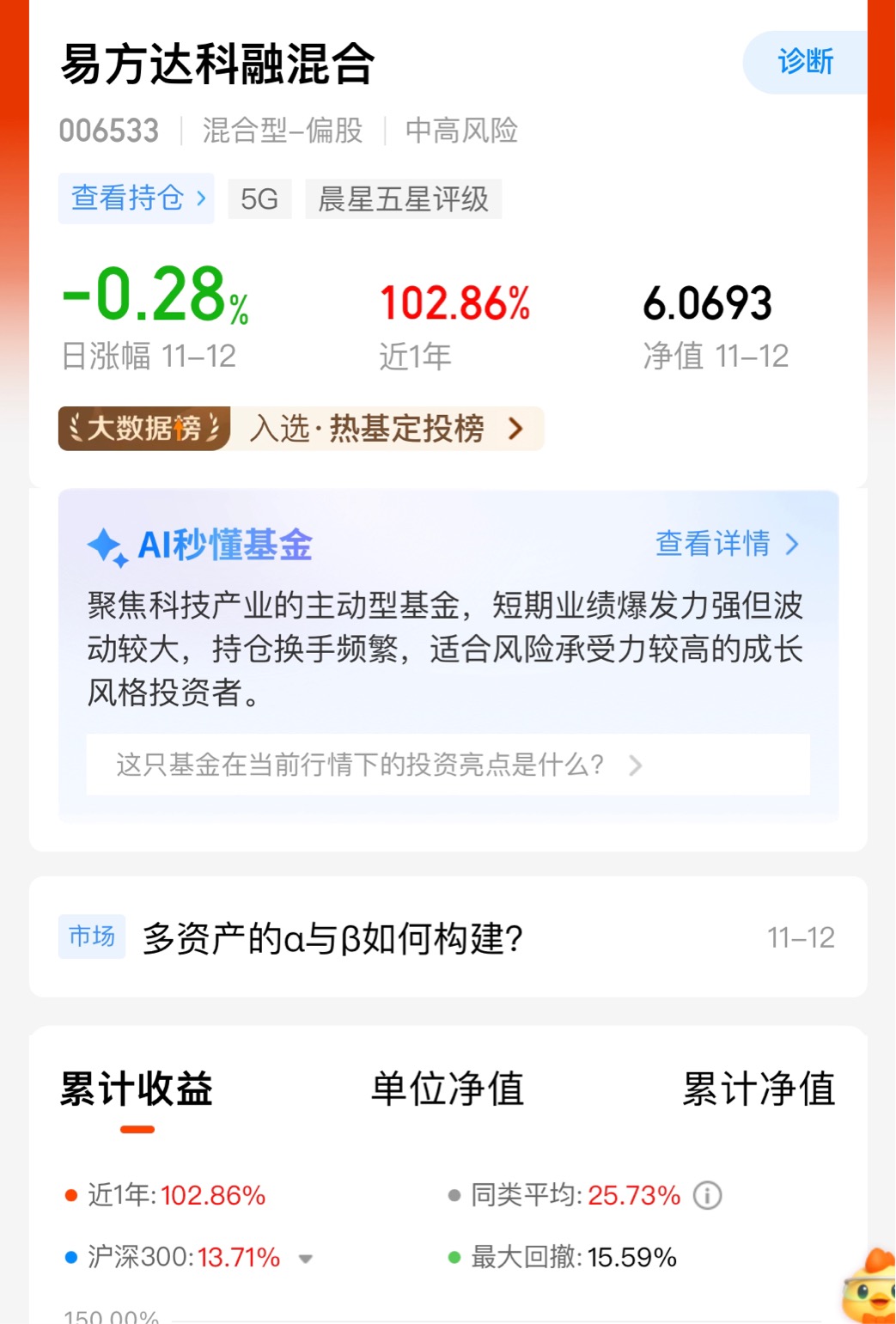 今日市场行情全面回暖,科技赛道更是全面吃肉,不过近期板块轮动加快,单一的持仓很难避免风险,而我发现易方达科融混合的持仓布局会更加多元化,不但聚焦科技行业,同时还覆盖了反内卷相关新能源,非常符合当下政策大力支持方向,近三个月更是涨超41.49%,可见基金经理管理能力之强,同时机构占比超50%,能获得机构资金认可,说明其实力且优秀,我也准备开始布局起来啦!
