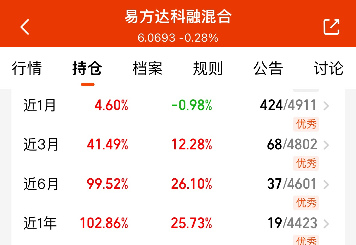 今日市场回暖,在新能源带动下沪指又出现新高,轮动太快了,这种行情我觉得还是要分散持有,在单一板块上押宝很难,像我持有的$易方达科融混合$ 就是布局A股+港股的科技和新能源方向,今天新能源爆发,又能能到上肉了,而且这个基业绩强,近一年上涨了102.86%,非常给力!