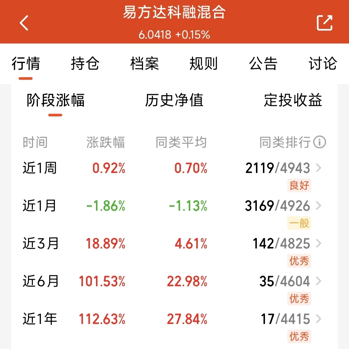 最近的市场虽然整体还是呈现震荡,但是科技表现的还是比较强,今天的科技也是继续迎来了突破。$易方达科融混合$ 这只主动的科技基金。聚焦科技成长赛道。长期表现的稳定性一直不错。近半年上涨了101.53%。近一年上涨了112.63%。而且主动的科技混合基金。基金经理每次做到了精准灵活调仓,遇到波动回撤控制的也是不错。今年来也是一直在创新高,我期待四季度继续创新高。