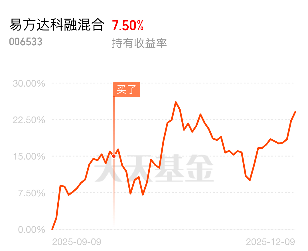 近期大盘虽震荡,但市场热度没减,单押科技风险太高,我更偏向攻守兼备的成长板块。我手里的$易方达科融混合$ 它在科技、军工、新能源之间轮动配置,今年以来涨超118%,近五年业绩同类第一,机构持仓占比高认可度足。早盘科技调整时它也没慌,午后跟着大盘拉升,回撤控制得特别好,持有体验很安心。