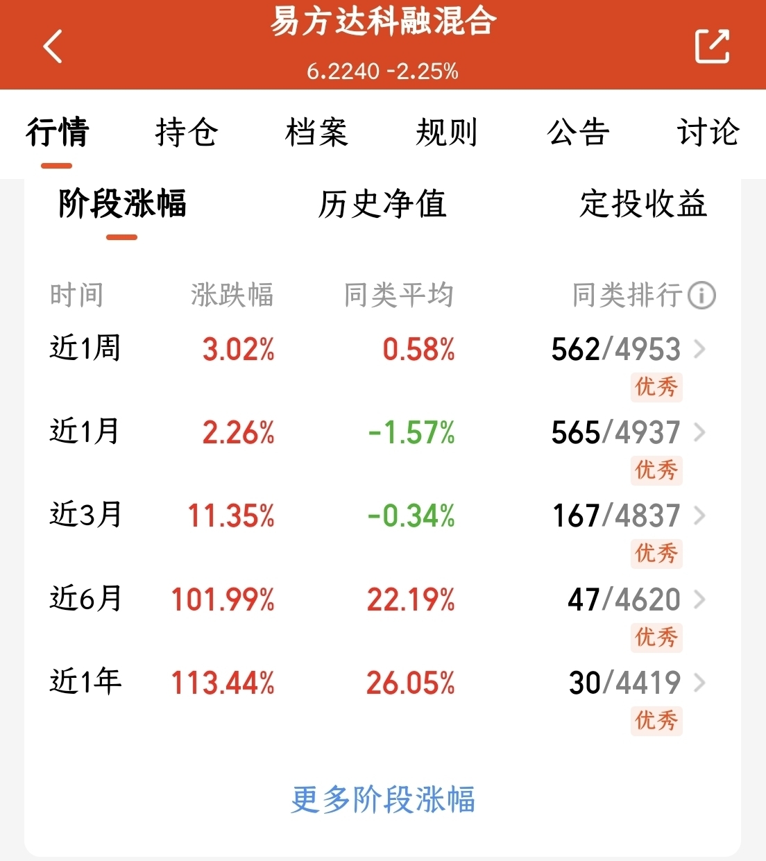 今日市场探底回升,反弹行情或将启动。震荡轮动下,均衡布局仍是关键。我看好$易方达科融混合$ 基金,聚焦科技主线,兼顾赛道轮动。该基金近年表现优异,六年涨幅超五倍,夏普比率较高,抗跌性强。机构持有比例达50%,显示资金认可。长期持有有望收益稳健。