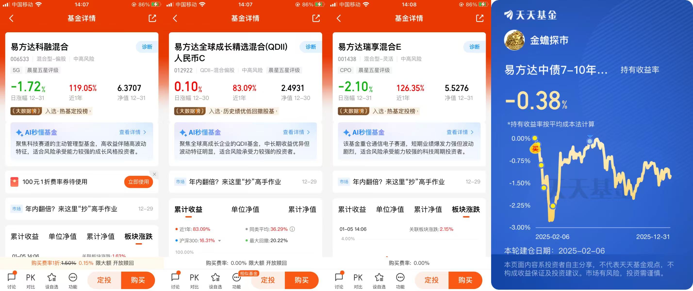 还有个关键操作是定期再平衡。我设定每半年调一次仓,比如三季度末美股科技占比涨到了 40%,超出了我预设的 30% 上限,就卖了一部分,补到当时比例偏低的债券基金里。这一步看着简单,却逼着我 “高抛低吸”,避免了单一资产占比过高的风险。而易方达那只债基,全年收益虽然不算高,但胜在稳,每次其他资产波动大的时候,它都能让账户净值少跌点,持有体验特别好。