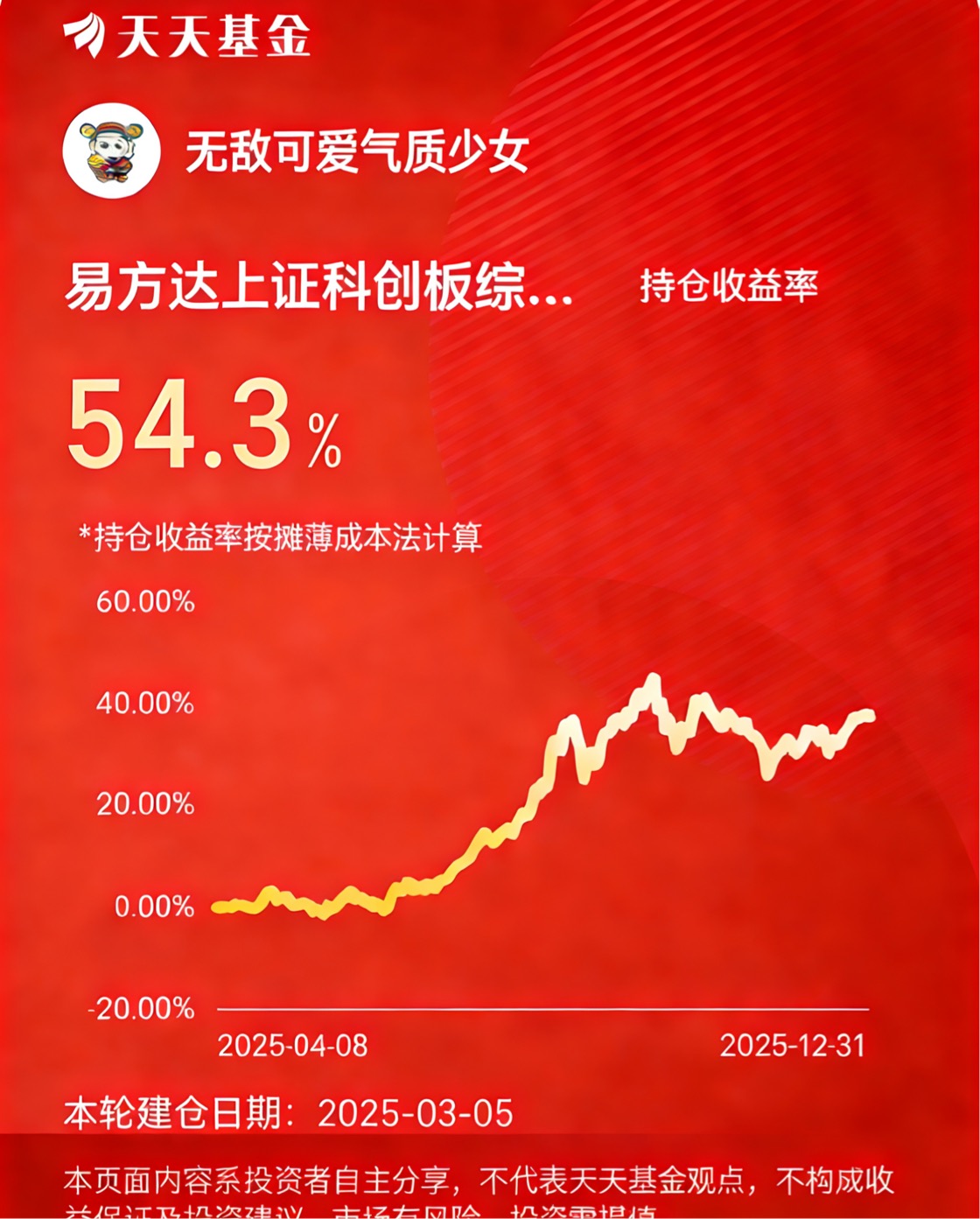 持仓过程中,基金的表现也印证了我的判断。上半年半导体设备、材料环节迎来业绩兑现,基金净值随之上行;下半年AI算力需求爆发,科创板的科技企业再次迎来风口,持仓的龙头标的贡献了可观收益。截至年末,基金的持仓收益率达到54.3%,远超我的预期,这不仅是赛道红利的体现,更是对“坚守”的最好回报。
