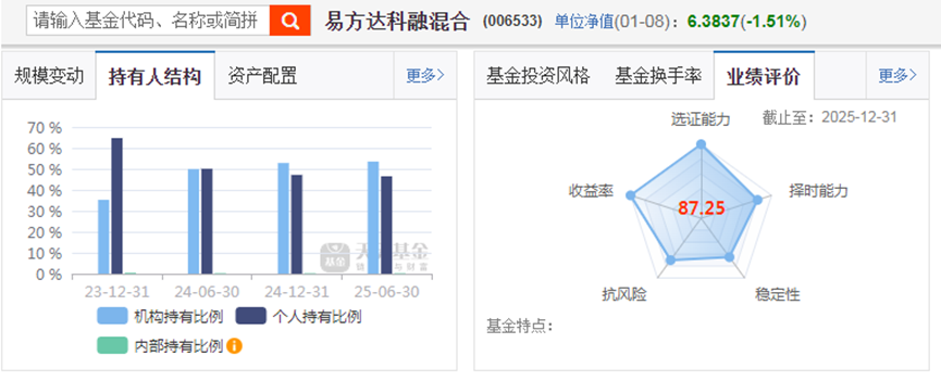 长期业绩卓越的基金,都没有逃过机构的眼睛,请看下图的数据。机构的持有比例,在稳定增长,最新一期机构的持仓占比,超过了50%。规模也从2025年6月30日的28.91亿增长到2025年3季度的83.30亿。稍加计算,发现仅在去年3季度,机构至少买入了27亿。